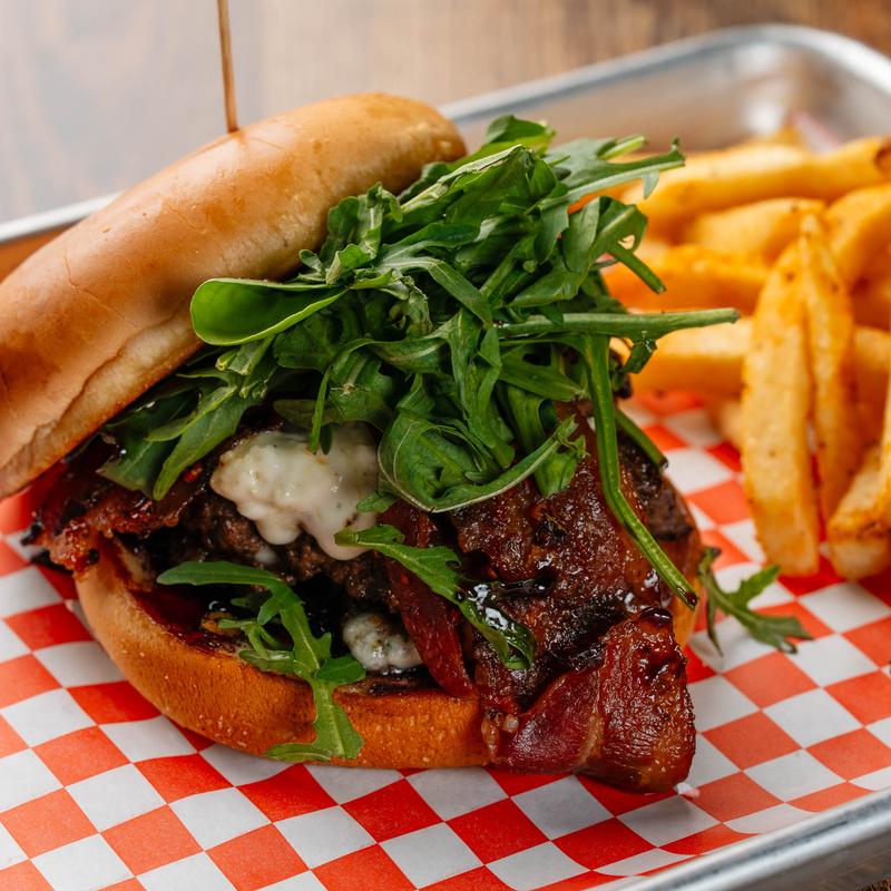 2 beef patties, blue cheese crumbles, a dash of blue cheese dressing, finished with candied bacon and arugula. Sweet and savory goodness.